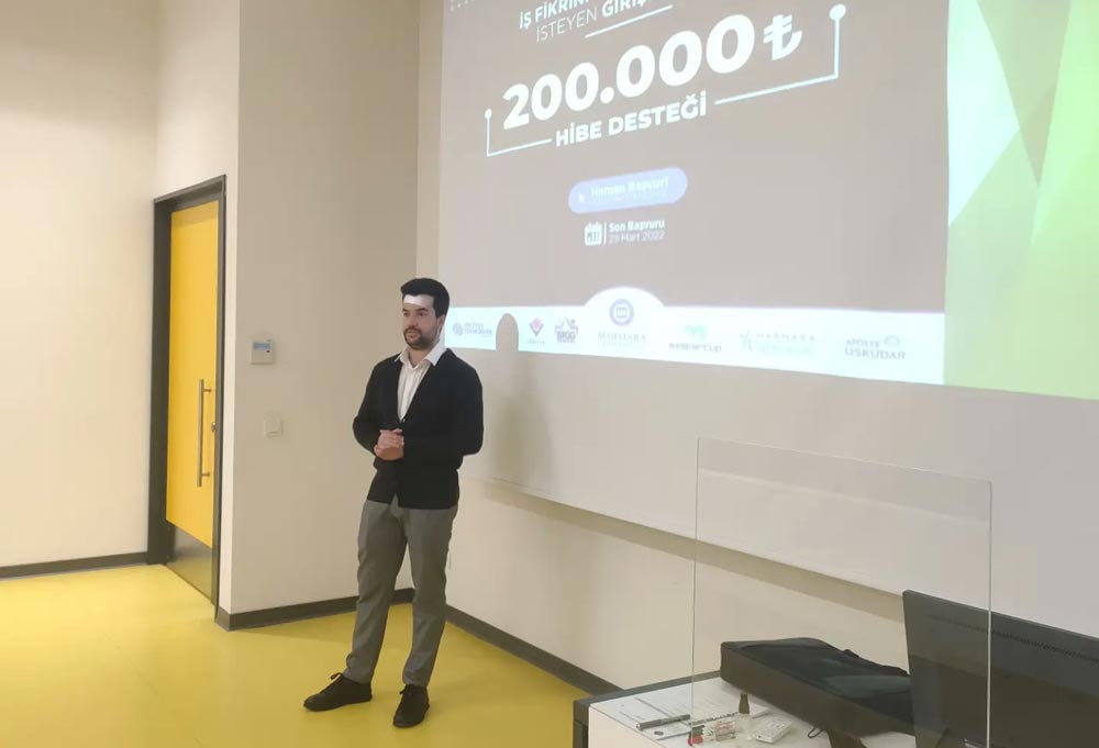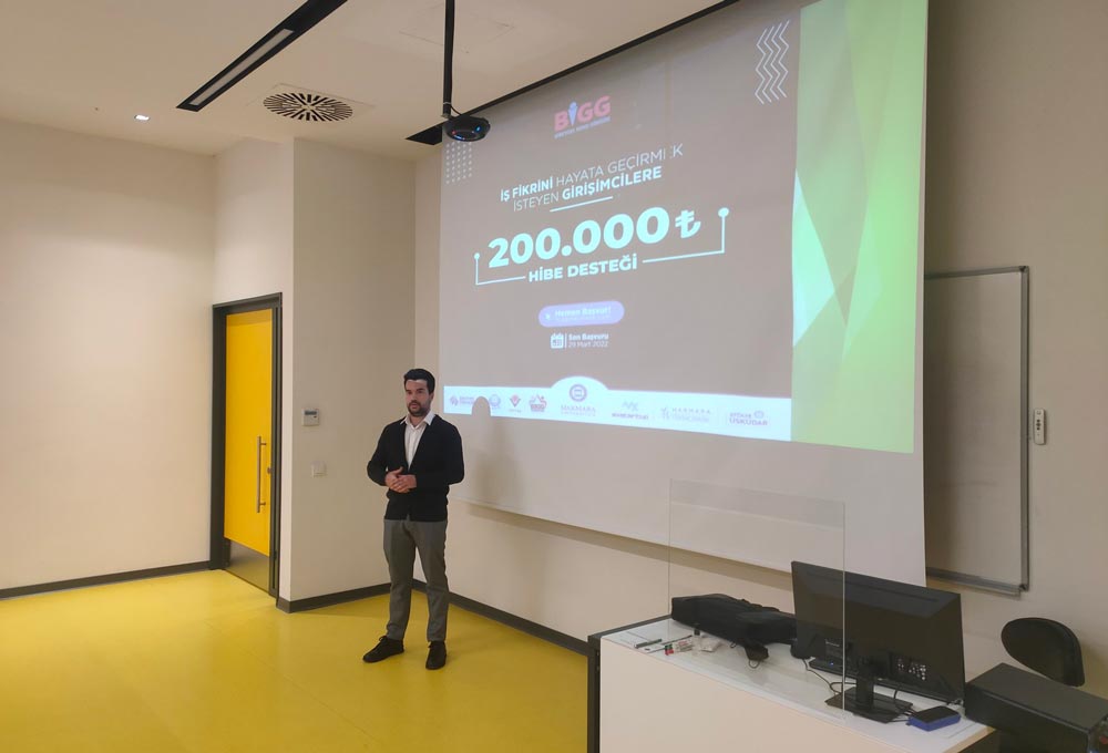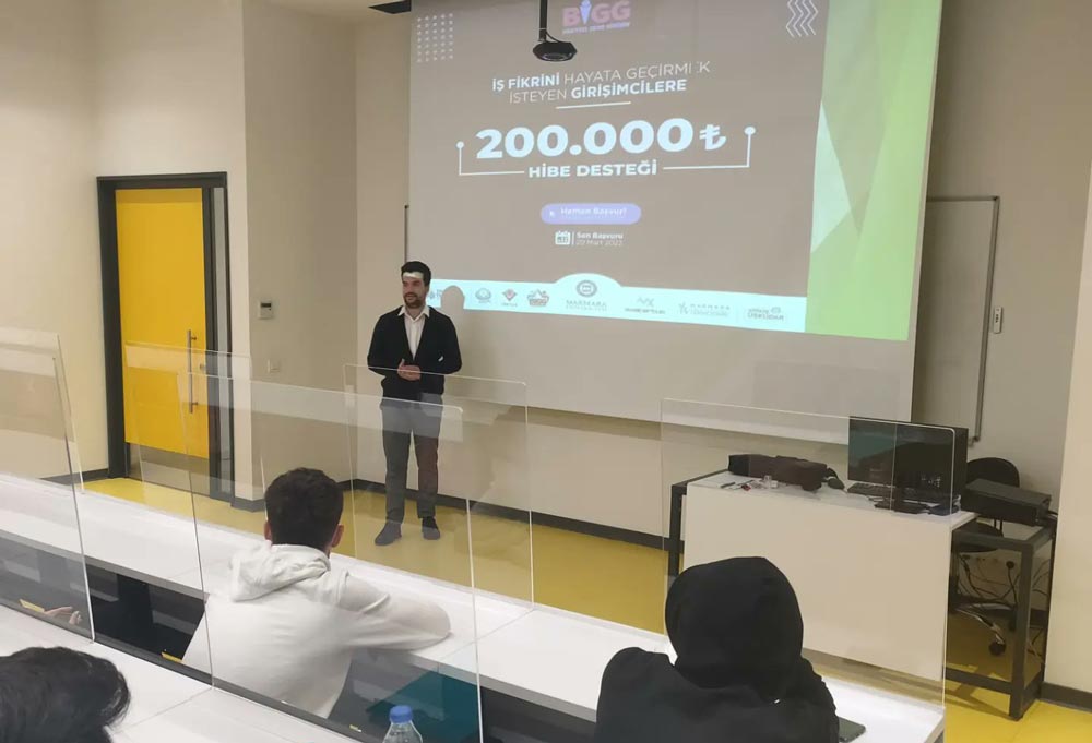 The Individual Young Entrepreneurship (BIGG) Program, in which 200 thousand TL grant support is provided to entrepreneurs who want to realize their business idea, was introduced to the students of the Faculty of Economics and Administrative Sciences by Marmara University Teknopark Inc. Entrepreneurship and Incorporation Specialist Doğukan Gezinti.