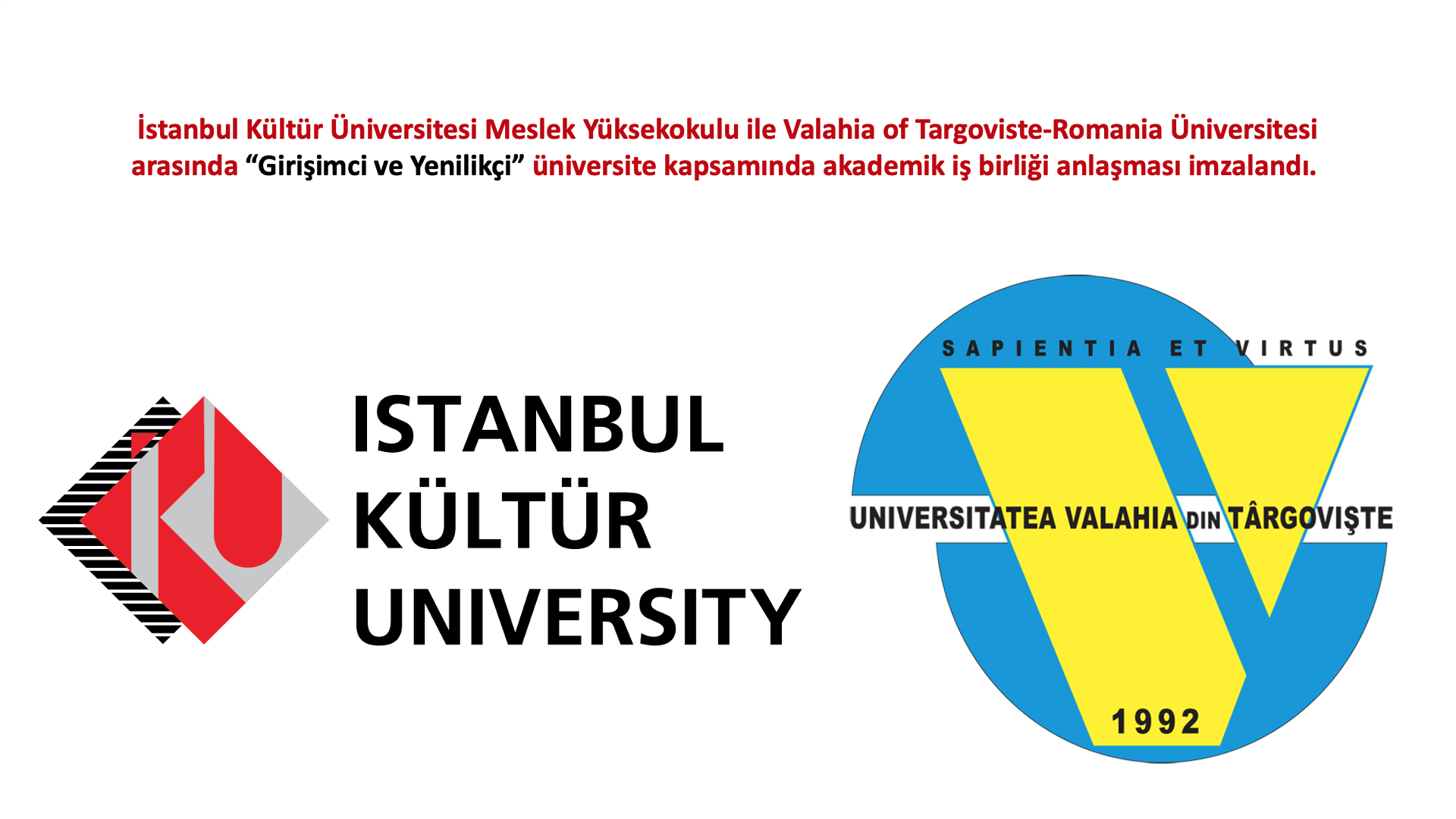 An academic collaboration agreement has been signed between Istanbul Kültür University (IKU) Vocational School (MYO) and Valahia of Targoviste-Romania Univeristy, under the scope of “Entrepreneur and Innovative” university.