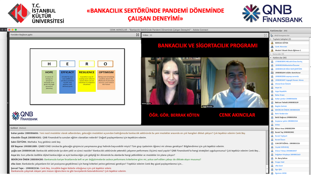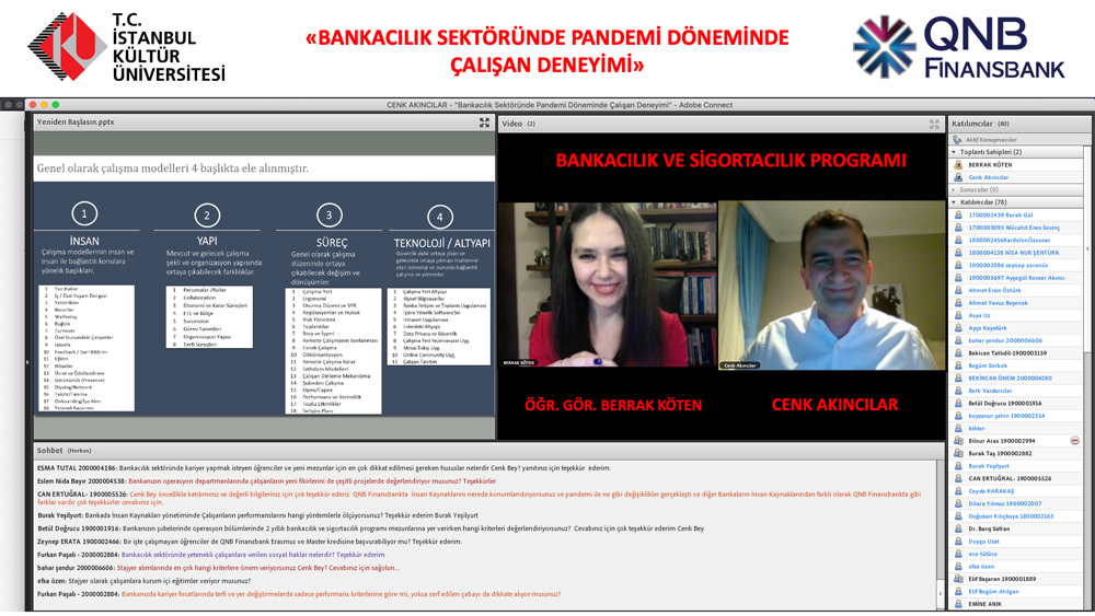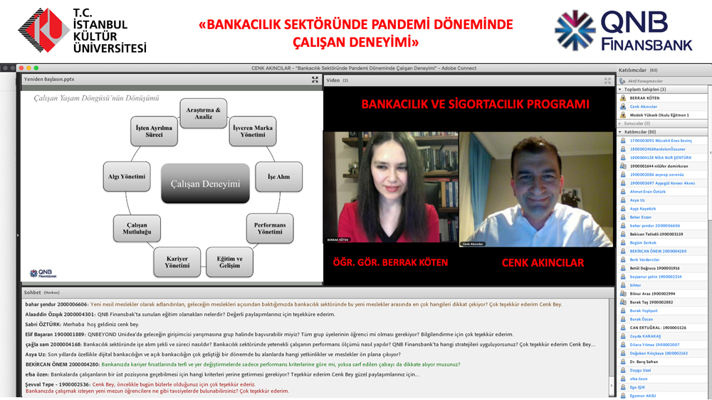 Istanbul Kültür University Vocational School Program of Banking and Insurance organized an e-seminar titled “Employee Experience in the Banking Sector During Pandemic Period”. Cenk Akıncılar, Deputy General Manager of Human Resources at QNB Finansbank, was the guest of the event, where Head of the Program of Banking and Insurance Evening Education Lecturer Berrak Köten was the moderator.