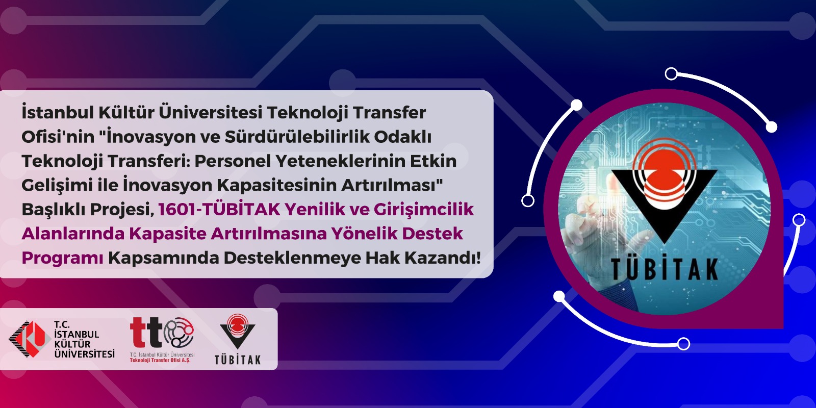 The project titled “Innovation and Sustainability-Oriented Technology Transfer: Increasing Innovation Capacity with Effective Development of Staff Capabilities” within the scope of “1601-TÜBİTAK Support Program for Increasing the Capacity in the Fields of Innovation and Entrepreneurship” applied by Istanbul Kültür University Technology Transfer Office (TTO), which is one of the Technology Transfer Offices has been granted to receive funds.