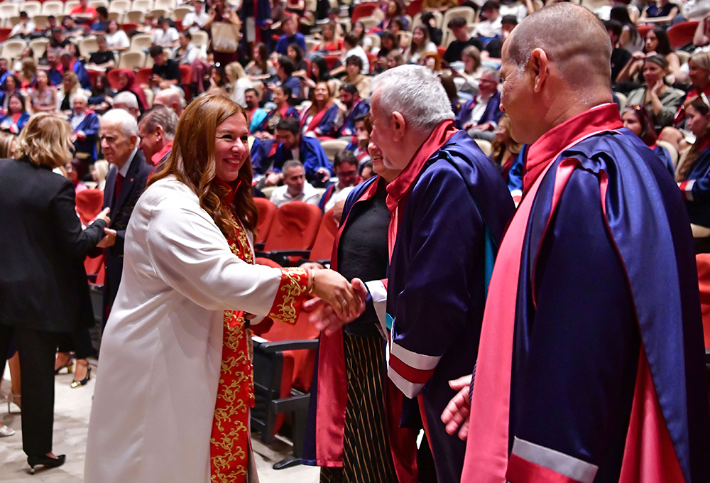 Our university has also taken the first step in its new campus investment, which will mark its 30th anniversary. We are planning our groundbreaking ceremony for October 17, 2025. I would like to express our gratitude to our Board of Trustees Chair and Founder, Dr. Bahar Akıngüç Günver, who sustains IKU with its own resources and transfers all the earnings from education back into education with its values; to Dear Ful Akıngüç, Chairperson of the Founding Foundation's Board of Directors and Vice President of the Board of Trustees; and to Dear Lale Akıngüç, Board Member and Vice Chair of the Foundation’s Board of Directors, on behalf of our university."