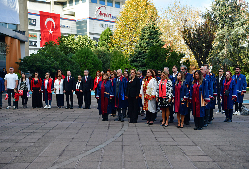 Istanbul Kültür University celebrated the 101st anniversary of the declaration of the Turkish Republic on Tuesday, October 29, with a ceremony held at the front garden of the Ataköy building on the Bakırköy Campus. Attended by the Board of Trustees, the Rectorate, deans, and academic and administrative staff, the event began with a moment of silence and the National Anthem, followed by a wreath-laying ceremony at the Atatürk bust.