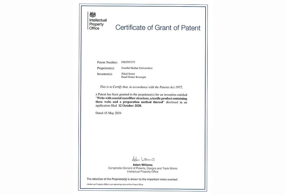 Our Faculty of Engineering academician Prof. Dr. Nihal Sarıer (IKU) and Prof. Dr. Emel Önder Karaoğlu (ITU, Faculty of Textile Technologies and Design)'s second international patent titled "WEBS WITH COAXIAL NANOFIBER STRUCTURE, A TEXTILE PRODUCT CONTAINING THESE WEBS AND A PREPARATION METHOD THEREOF (KOAKSİYEL NANOLİF YAPILI AĞLAR, BU AĞLARI İÇEREN BİR TEKSTİL ÜRÜNÜ VE HAZIRLANMA YÖNTEMİ)” was registered by the UK Patent Office on 15.05.2024 with the number GB2597373.