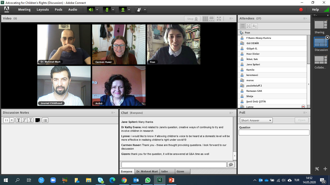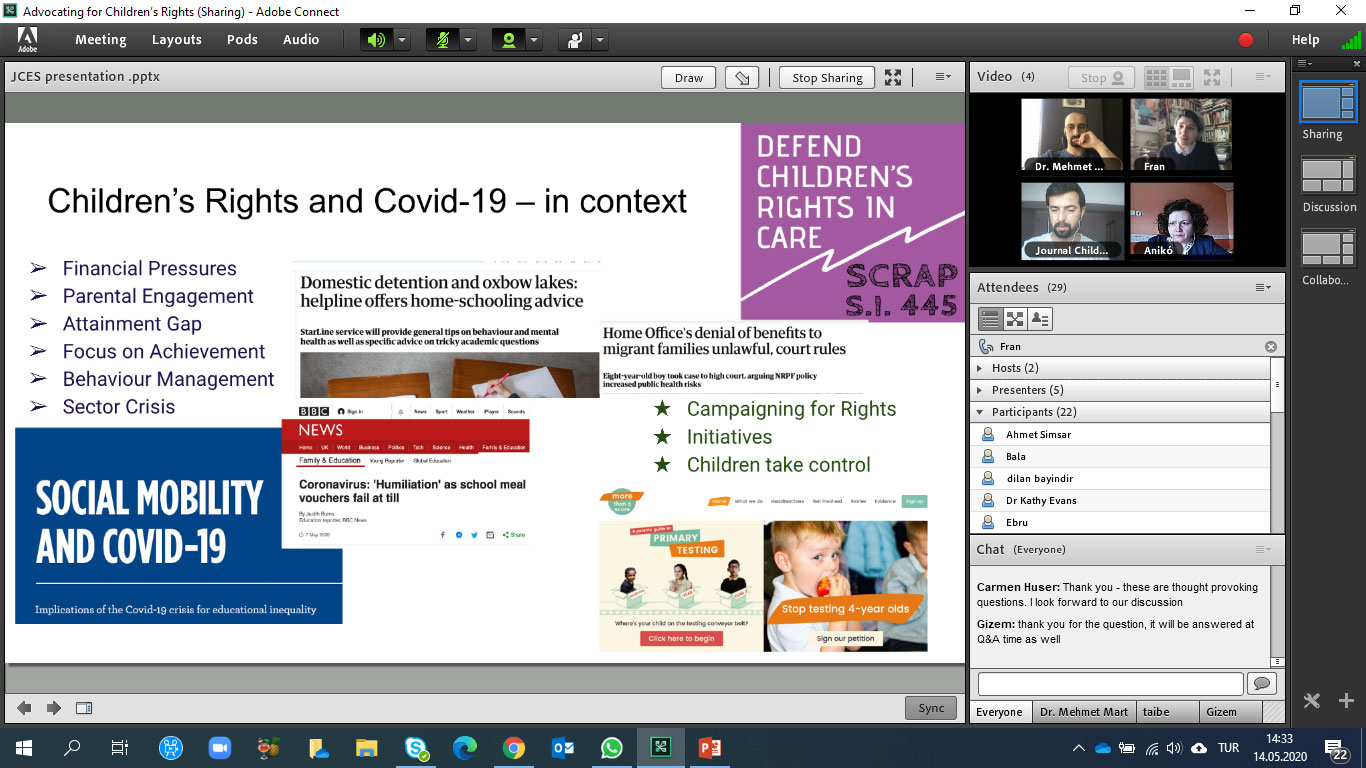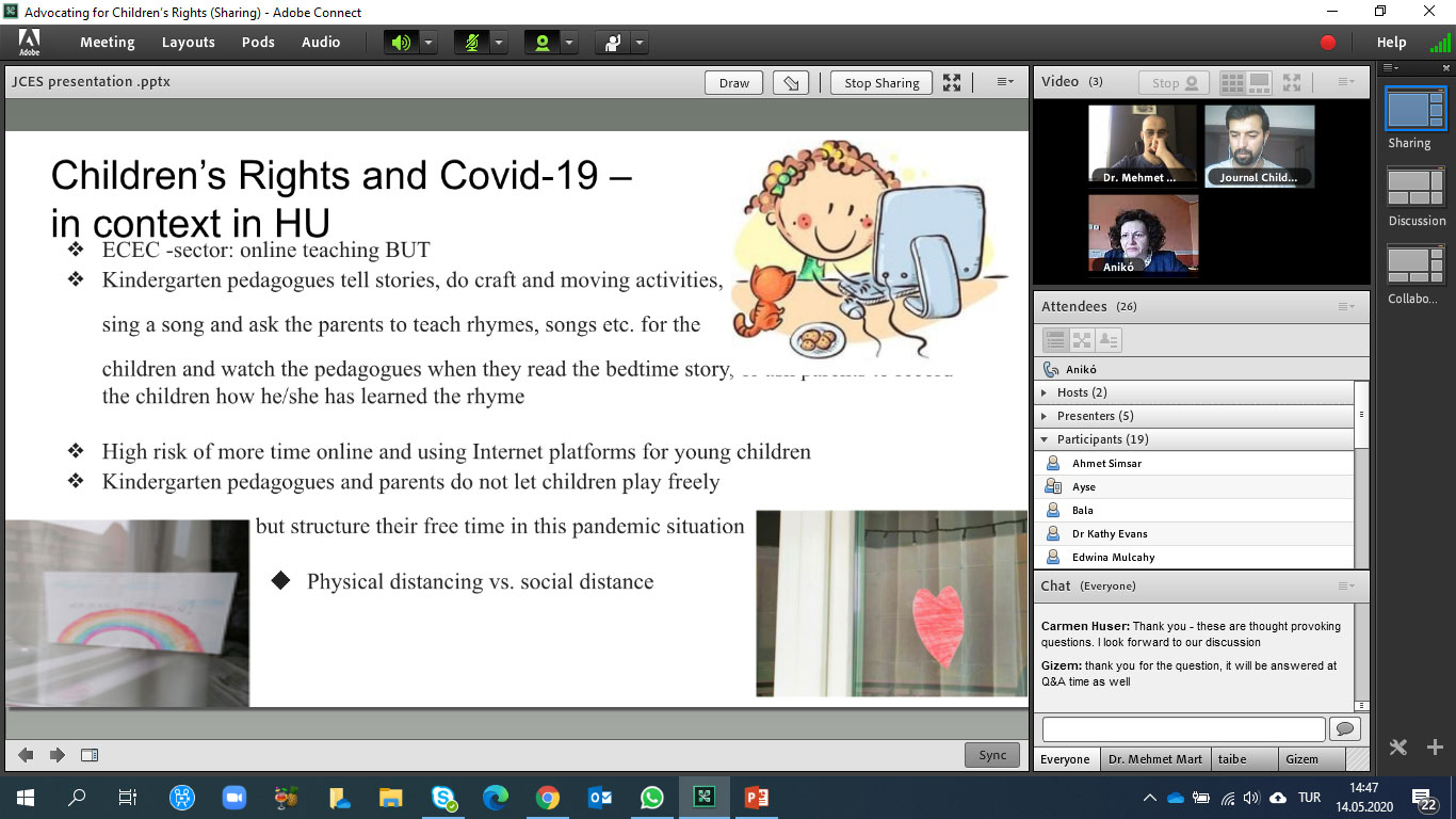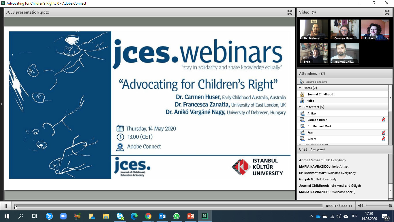 “jces.webinars: childhood under the quarantine” webinarlar dizisinin ilki, 14 Mayıs 2020 Perşembe günü saat 14.00’te düzenlendi. Dr. Carmen Huser (Early Childhood Australia, Avusturalya), Dr. Francesca Zanatta (University of East London, İngiltere) ve Dr. Anikó Vargáné Nagy’nin (University of Debrecen, Macaristan) katılımlarıyla “Advocating for Children’s Rights (Çocuk Haklarını Savunmak)” temasında gerçekleştirilen webinarda; COVID-19 bağlamında çocuk haklarını değerlendirilmesi, savunulması, çocuklarla alakalı bilimsel araştırmaların bu süreçte ne gibi etik ilkeler bağlamında yapılacağı tartışıldı. 1.5 saat süren ve oldukça ilgi gören webinarı, Türkiye’nin yanı sıra birçok ülkeden katılımcı takip etti.