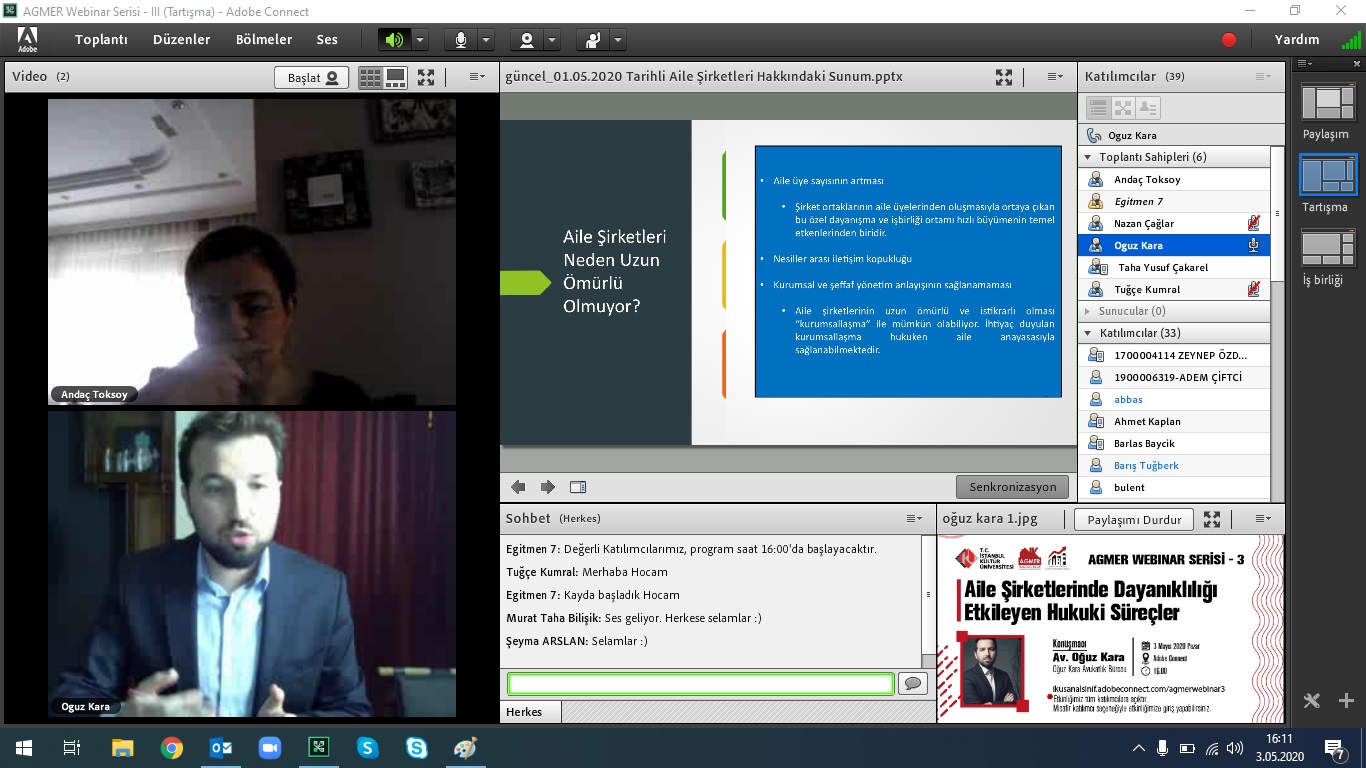 Aile İşletmeleri ve Girişimcilik Uygulama ve Araştırma Merkezi (AGMER) tarafından düzenlenen “AGMER Webinar Serisi (Bireysel ve Kurumsal Dayanıklılık)”nin üçüncüsü, 3 Mayıs Pazar günü saat 16.00’da “Aile Şirketlerinde Dayanıklılığı Etkileyen Hukuki Süreçler” başlığı ile Adobe Connect Sanal Sınıf Uygulaması üzerinden gerçekleştirildi. AGMER Müdür Yardımcısı Dr. Öğr. Üyesi Andaç Toksoy moderatörlüğündeki etkinliğe, Avukat Oğuz Kara konuşmacı olarak katıldı. Aile şirketlerinde devir sözleşmeleri, aile meclisi/konseyi, aile anayasası gibi konuların tartışıldığı etkinliğin sonunda konuşan AGMER Müdürü Dr. Öğr. Üyesi Nazan Çağlar, webinar serisinin devam edeceğini belirtti.