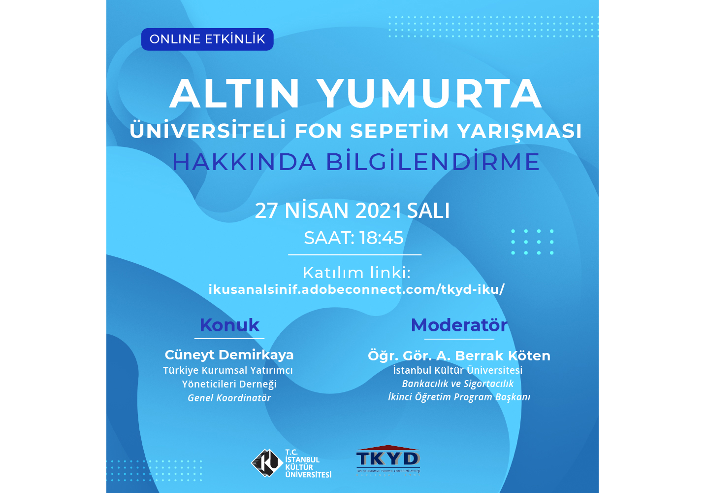 İstanbul Kültür Üniversitesi Meslek Yüksekokulu Bankacılık ve Sigortacılık Programı, “Altın Yumurta Üniversiteli Fon Sepetim Yarışması” hakkında öğrencilerimizi bilgilendirmek amacıyla 27 Nisan 2021 Salı günü saat 18.45’te online toplantı düzenleyecek. Bankacılık ve Sigortacılık İkinci Öğretim Program Başkanı Öğr. Gör. A. Berrak Köten’in moderatörlüğünü üstleneceği etkinliğe, Türkiye Kurumsal Yatırımcı Yöneticileri Derneği (TKYD) Genel Koordinatörü Cüneyt Demirkaya konuk olacak. Cüneyt Demirkaya yarışmaya katılmak isteyen öğrencilerimize yarışma hakkında detaylı bilgiler verecek. Tüm öğrencilerimizi etkinliğimize bekliyoruz.