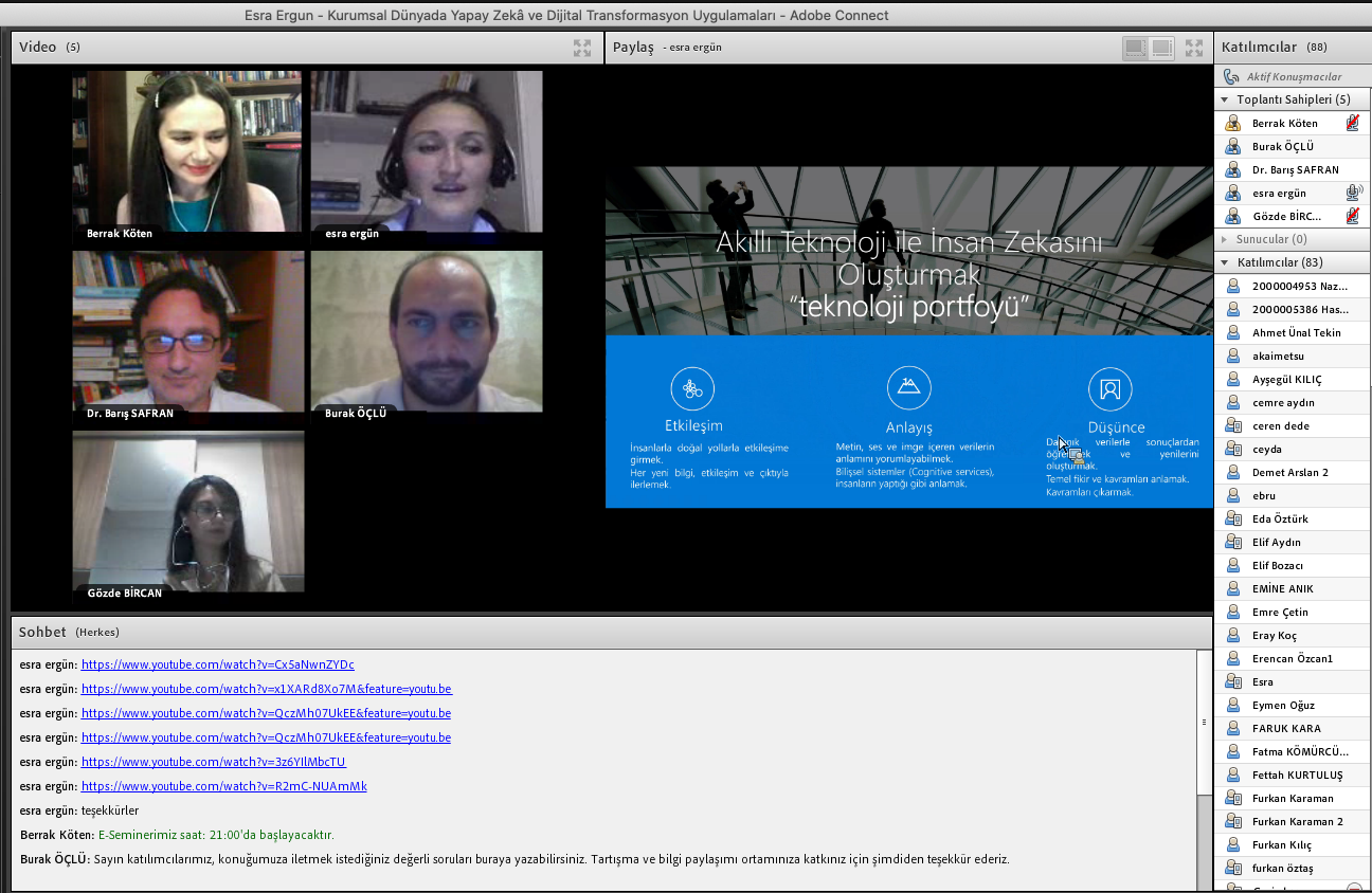 Öğr. Gör. Berrak Köten, Öğr. Gör. Dr. Barış Safran, Öğr. Gör. Burak Öçlü ve Öğr. Gör. Gözde Bircan ile ve tüm katılımcıların sorularını yanıtlayan Esra Ergün yapay zekâ uygulamalarının yaygınlaşmasıyla çok çeşitli disiplinleri içinde barındırdığını belirterek uzmanlık ve ilgi alanları doğrultusunda odaklanılması gerektiğinin altını çizdi. Öğrencilerimize, bu alandaki sektörel yayınları, işletmecilik dergilerini ve webinarları takip etmelerini önerdi.