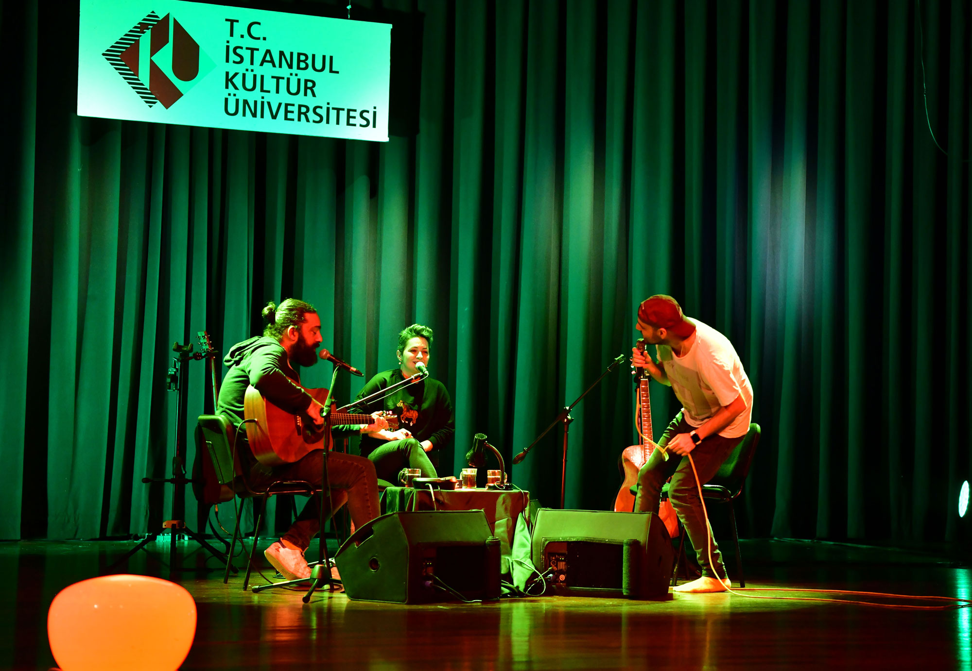 İstanbul Kültür Üniversitesi Akıngüç Oditoryumu ve Sanat Merkezi, birbirinden güzel etkinlikleri Kültür’lülerle ve sanatseverlerle buluşturmaya devam ediyor. İKÜ Güzel Sanatlar Uygulama ve Araştırma Merkezi (GSUAM), 27 Aralık Perşembe günü “Büyük Ev Ablukada” müzik grubunu Üniversitemizde ağırladı. Kurulduğu günden bu yana kendine özgü tarzı, müziği, şarkı sözleri ve tamamı takma isimlerden oluşan grup üyeleriyle dikkat çeken Büyük Ev Ablukada, “Ay Şuram Hâlâ Ağrıyo – Akustik Konserler” serisi kapsamında Akıngüç Sahnesi’nde müzikseverlere unutulmaz bir gece yaşattı.