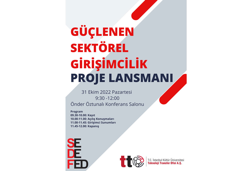 İKÜ Teknoloji Transfer Ofisi (TTO) A.Ş. ile Sektörel Dernekler Federasyonu (SEDEFED) iş birliğinde, 31 Ekim Pazartesi günü 9.30-12.00 saatleri arasında Önder Öztunalı Konferans Salonu'nda "Güçlenen Sektörel Girişimcilik Proje Lansmanı" düzenlenecek.