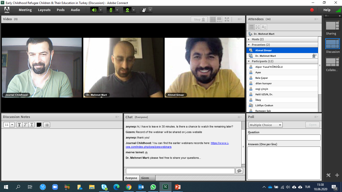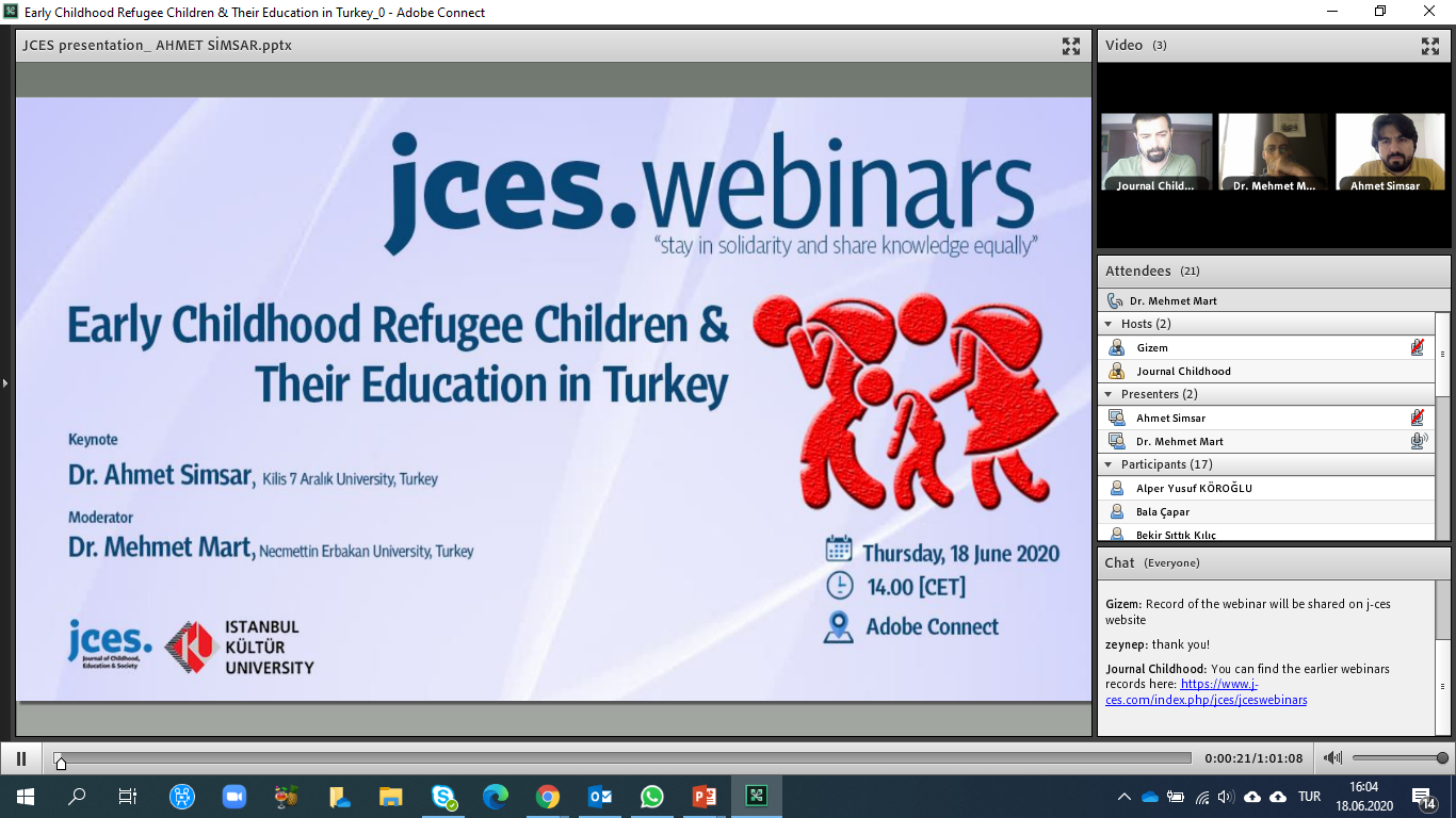 Bilimsel yönetimini JCES Kurucu Editörü ve Eğitim Fakültesi öğretim üyelerimizden Doç. Dr. Mehmet Toran, moderatörlüğünü ise Necmettin Erbakan Üniversitesi öğretim üyelerinden Dr. Mehmet Mart’ın üstlendiği webinarda; Kilis 7 Aralık Üniversitesi öğretim üyelerinden Dr. Ahmet Simsar bir sunum yaptı. Türkiye’de göçmenlerin genel durumu, özellikle erken çocukluk döneminde uygulanan eğitim programları ve öğretmen yetiştirme programlarının tartışıldığı webinara, göç ve çocuklar konusuna ilgi duyan birçok kişi ilgi gösterdi.