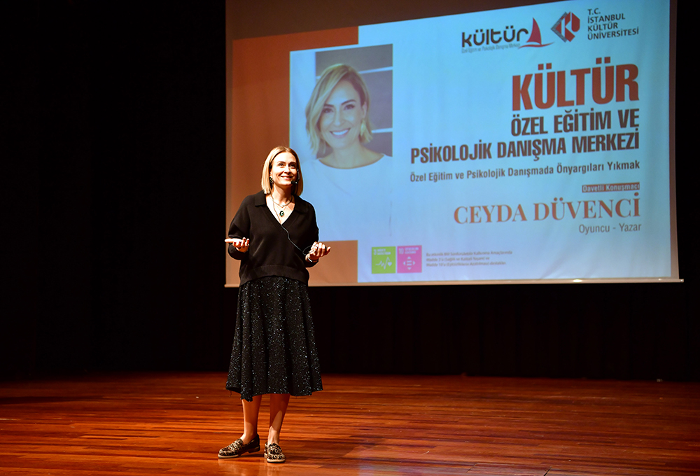 Üniversitemizin özel eğitim ve psikolojik danışma alanında 2023 yılında hizmete açtığı Kültür Özel Eğitim ve Psikolojik Danışma Merkezi’nin lansmanı yapıldı. Lansmanda, toplum temelli çalışmalar kapsamında Oyuncu & Yazar Ceyda Düvenci "Özel Eğitim ve Psikolojik Danışmada Toplumsal Ön Yargılarla Mücadele" söyleşisiyle gençler ve ailelerle bir araya geldi. Düvenci, “Sadece özel ihtiyaç sahibi çocuğa sahip ailelerin değil, toplumumuzda herkesin bir psikoloğu olmalı. Çünkü uzman biriyle içimizdekileri dertleşmek, kendimizi güncellemek, ağlayamadığımız şeyler için ağlamak, ruhsal anlamda biraz daha güçlenmek ancak psikolojik destekle mümkün olur.” dedi.