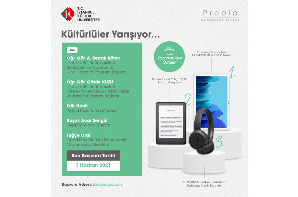 Türkiye’nin önde gelen dermatologlarından Doç. Dr. Yasemin Oram tarafından geliştirilen Propia, İstanbul Kültür Üniversitesi öğrencilerine özel yarışma düzenliyor. Jürinin değerlendirmesi sonucu Propia için en iyi dijital proje önerilerini hazırlayan ilk 3 öğrenci, birbirinden güzel ödüllerin sahibi olacak.