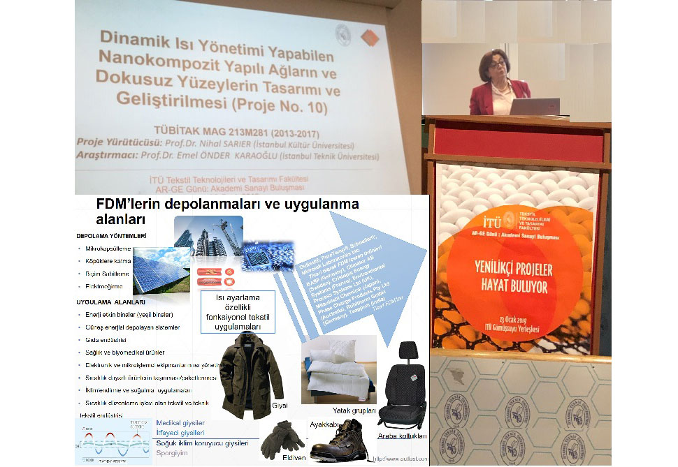 İTÜ Tekstil Teknolojileri ve Tasarımı Fakültesi ev sahipliğinde 23 Ocak 2019 Çarşamba günü Gümüşsuyu Kampüsünde düzenlenen AR-GE günü kapsamında çeşitli işletmelerin Ar-Ge merkezlerinden üç yüzü aşkın izleyicinin katıldığı etkinlikte nanoteknoloji, teknik tekstiller, fonksiyonel tekstiller, tekstil teknolojileri, tekstil kimyası ve tekstil kompozitler alanında yaklaşık kırk bilimsel proje tanıtıldı. Prof.Dr. Nihal Sarıer’in (İKÜ) yürütücü, Prof.Dr. Emel Önder Karaoğlu’nun (İTÜ) araştırmacı olarak yer aldığı TÜBİTAK 213M281 nolu “Dinamik Isı Yönetimi Yapabilen Nanokompozit Yapılı Ağların ve Dokusuz Yüzeylerin Tasarımı ve Geliştirilmesi” projesinde geliştirdikleri endüstriyel kullanım potansiyeli yüksek olan, nanoağ yapılı ısı yönetimi ve ısı depolama işlevine sahip kompozitleri tanıttı. Düşük sıcaklık (T<18oC), normal sıcaklık (18oC<T<43oC) ve yüksek sıcaklık (43oC<T<70oC) bölgelerinde sıcaklık kontrollü ambalajlama, termal terapiye yönelik biyomedikal malzeme, termal sensörler, termoelektrik sistemler, soğuk ve sıcak iklim giysileri ve güneş enerjisi ile çalışan sistemlerde kullanıma elverişli ürün prototiplerine özel sektör ar-ge temsilcileri büyük ilgi gösterdi.